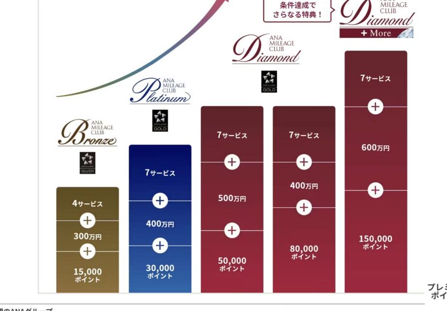 - ランクの種類:ANAステータスは、ブロンズ、シルバー、ゴールド、プラチナの4つのランクがあります。それぞれのランクには、異なる特典が付与されます。