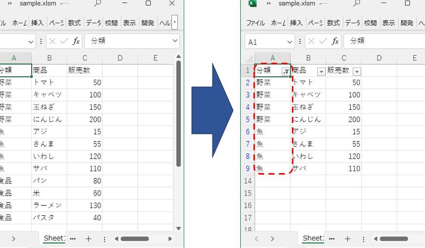 Range("A1:D100")。 - Filterメソッドを使用し、対象列を指定します。