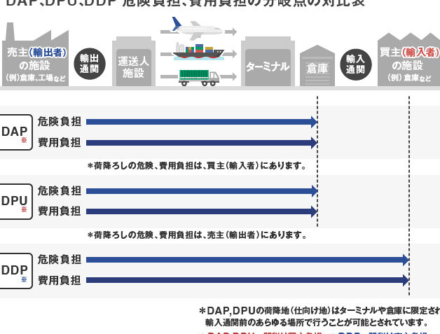 DAP (Delivered At Place): 売り手が指定の場所まで貨物を配送し、リスクを終える形です。
