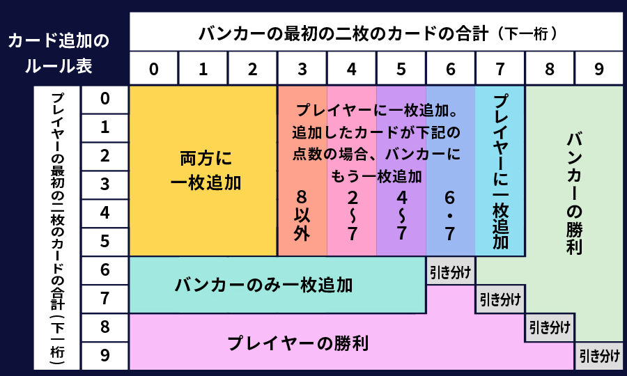 - 賭けの選択: プレイヤー、バンカー、タイの中でどれに賭けるか。バンカーの勝率がやや高いから、賭ける対象として優先される傾向がある。