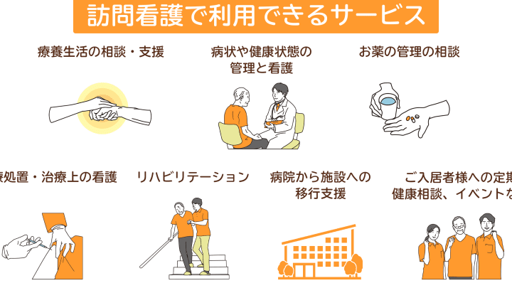 訪問看護とは、以下のサービスを含む医療行為です。