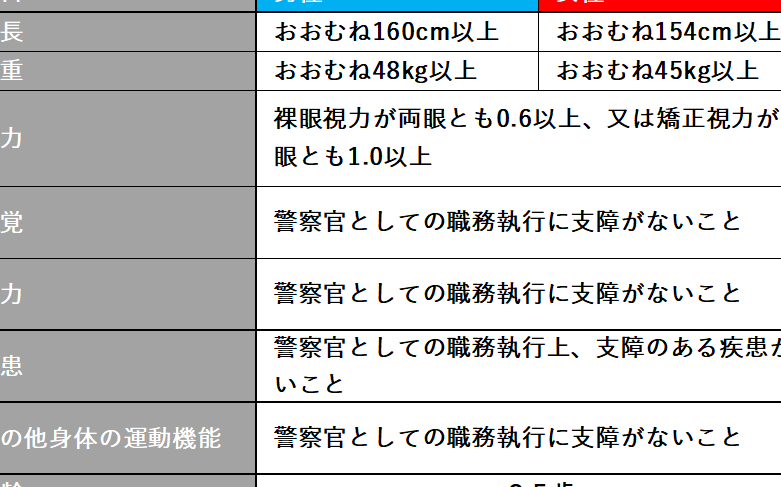 警察官に求められる身体的条件はいくつかある。これらの条件は職務を安全に遂行するために重要であり、健康診断や身体能力を通じて確認される。