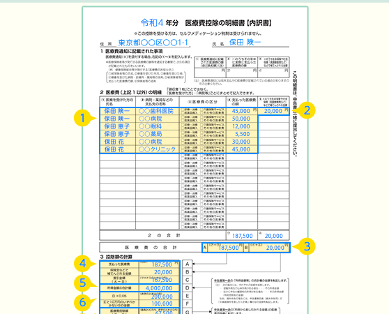 - 医療費の合計額を算出:年間中の医療費をすべて合算する。