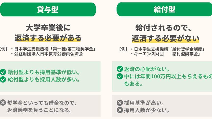 貸与型奨学金: 返済が必要な奨学金で、卒業後に一定の条件で返済する。日本学生支援機構の一般貸与と特別貸与がある。
