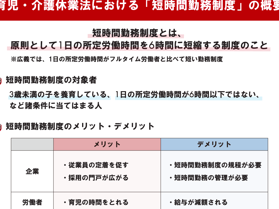 時短勤務は、ワークライフバランスを改善する重要な要素です。以下にその具体例を示します。