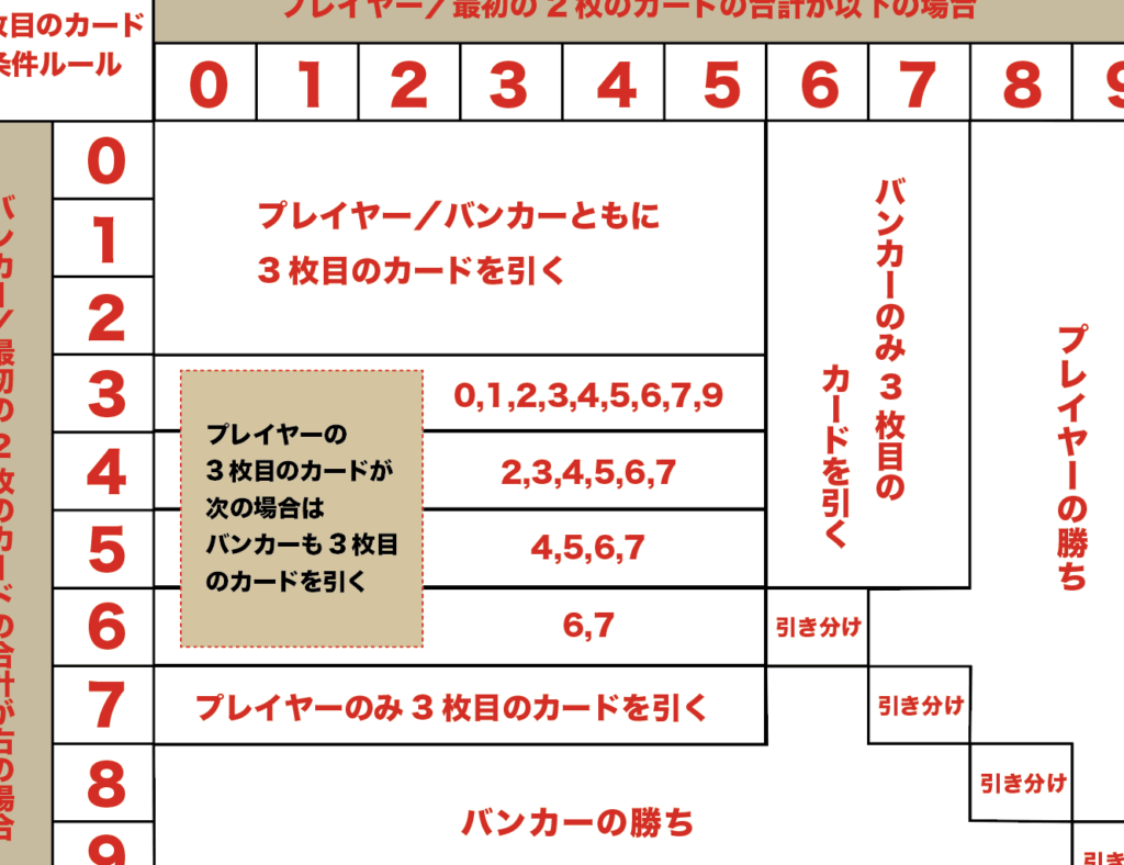 • 勝者は、最高ポイントを持つ側です。通常、プレイヤーが勝つ確率は約44.6%、バンカーが勝つ確率は約45.9%です。バンカーが勝つと5%のコミッションが発生します。