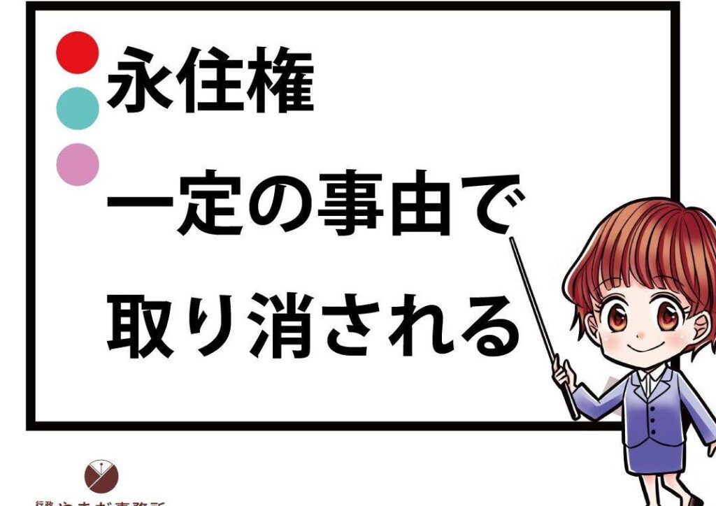 - 日本国籍の喪失:日本国により帰化が無効とされる場合、永住権も取り消されます。
