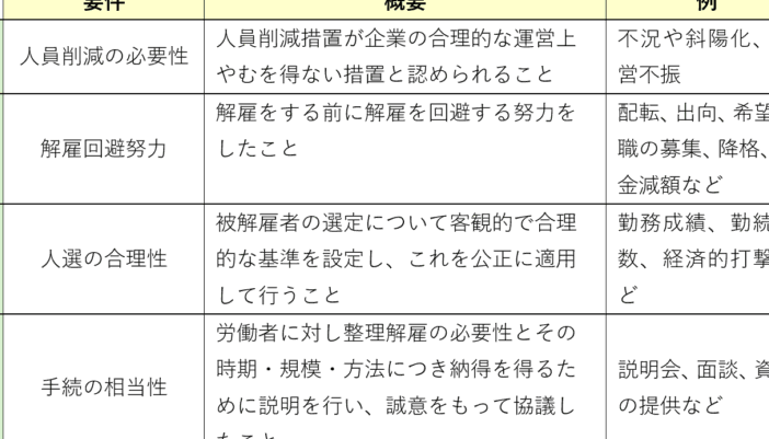 整理解雇を適法に行うためには、以下の4つの要件が必要です。