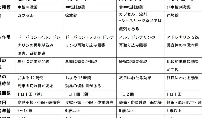 これらの薬にはそれぞれ特徴があり、患者の症状に応じて選択されます。また、副作用があるため、医師との相談が不可欠です。例えば、メチルフェニデート系の薬では、食欲減退や不眠が起こることもあります。