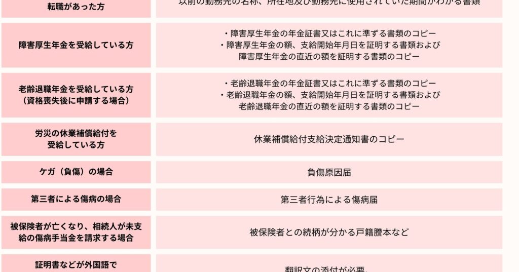 - 医師の診断書が必要。病気や怪我による就業不能を証明する診断書が不可欠です。