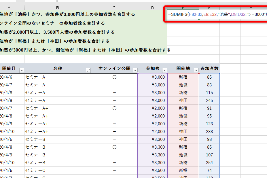 この公式を使用することで、条件「A」を持つ商品の売上が自動的に合計されます。
