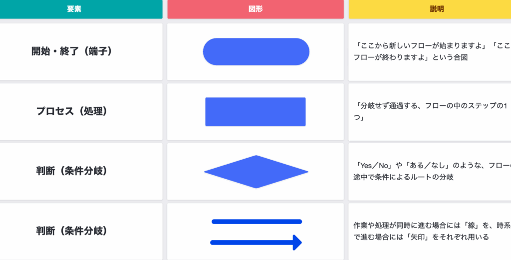フロー図は、プロセスやシステムの流れを示す図表です。以下の要素により構成されています。