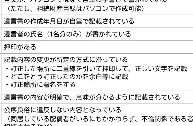 - 法的要件:法律に則った形式や証人の署名が必要。