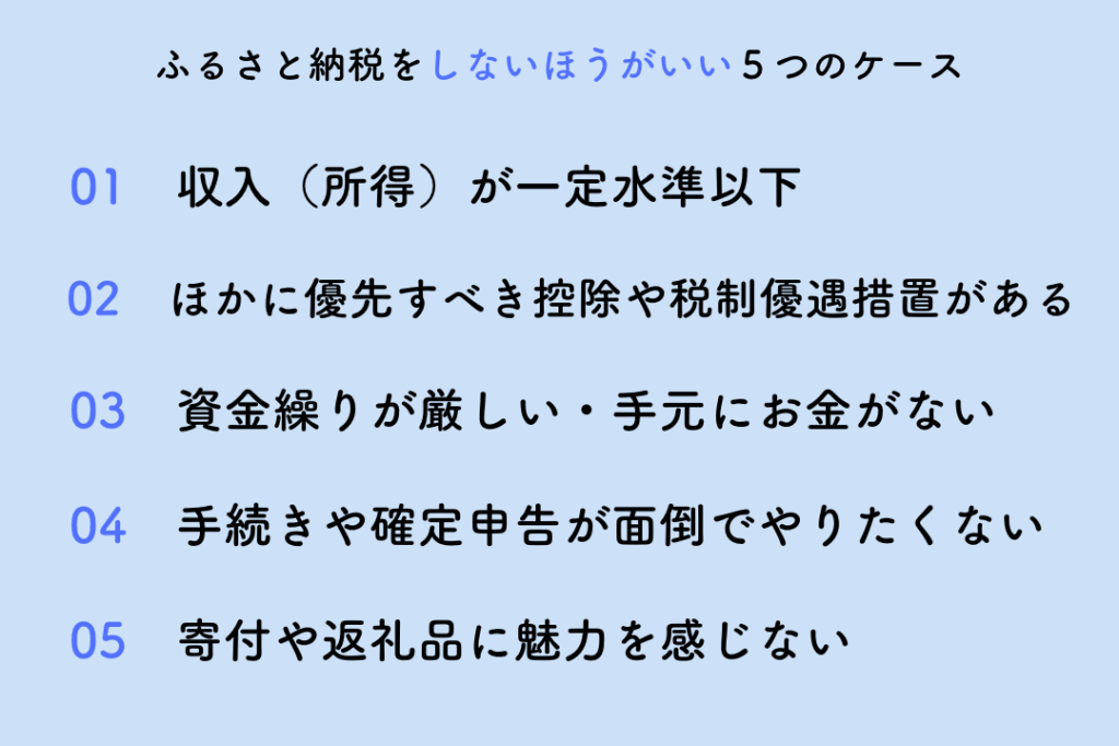 これらの理由から、収入が低い方にとって、ふるさと納税は現実的な選択肢になりにくい。