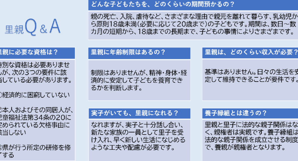 - 里親の役割: 里親は、子どもたちに愛情やサポートを提供し、彼らの成長を見守ります。