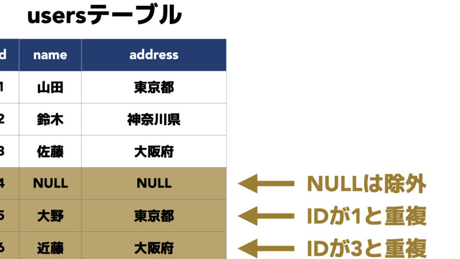 - COUNT(column_name) を使用: 特定カラムがNULLでない行のカウント。