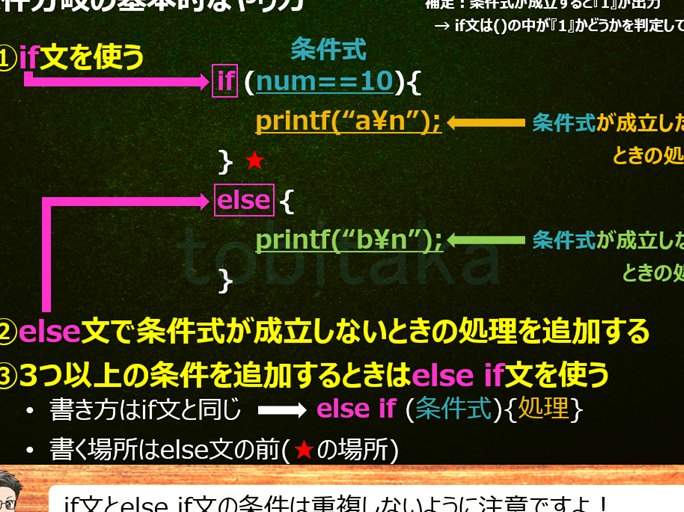 条件式は、特定の条件が成り立つかどうかを判断します。これにより、プログラムの動作が変わります。以下は、条件式に関する基本的なポイントです。