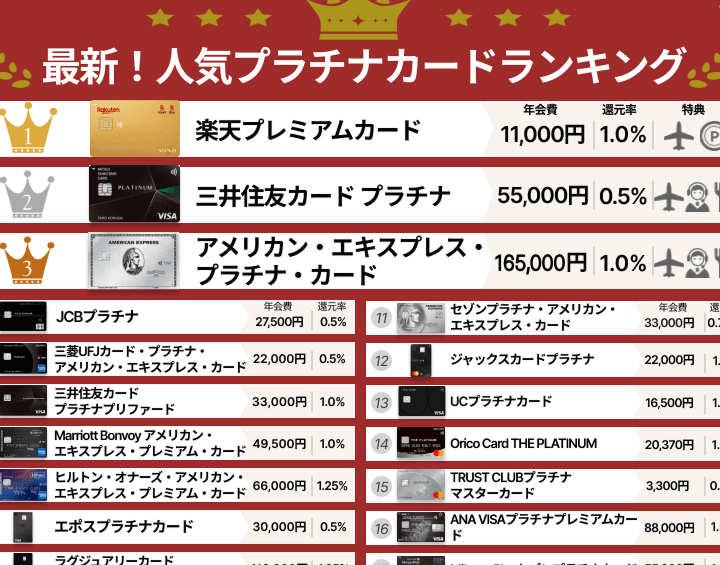- ポイント還元率:多くのプラチナカードは高いポイント還元率を提供し、特典や商品への交換が可能です。