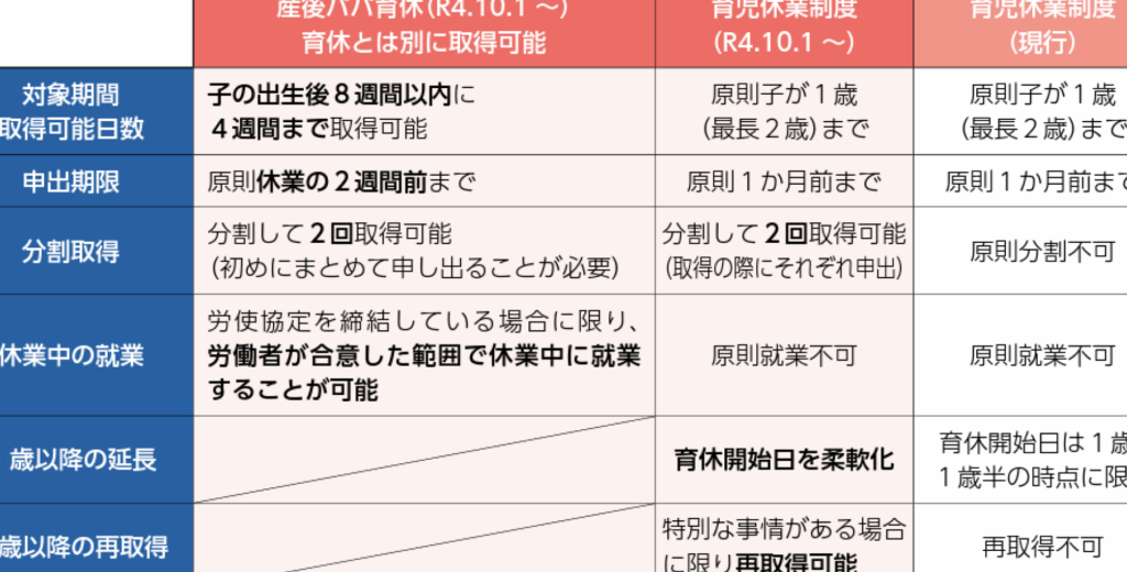 - 手続きの簡素化: 育児休業の申請手続きが簡素化され、利用しやすくなります。