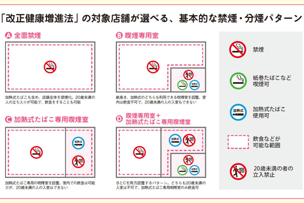 業態の変化:多くの飲食店が、禁煙を全面的に実施するか、指定喫煙室を設ける方向にシフト。