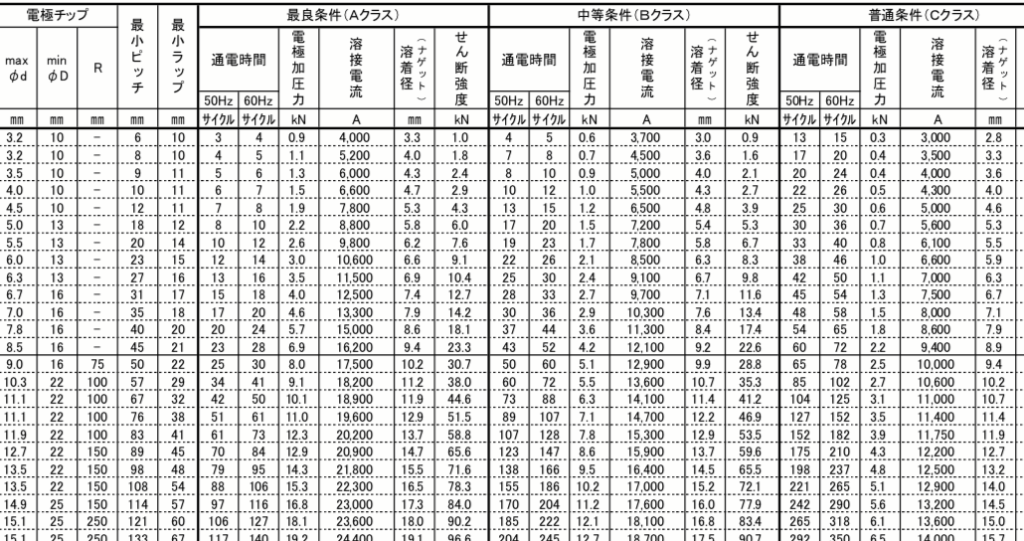 スポット溶接 条件表の概要