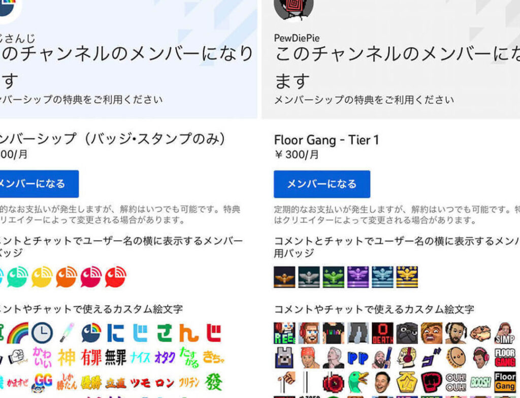 - 特典内容: 一部のクリエイターは、エモジ、バッジ、限定ライブ配信、特別な動画などを提供します。