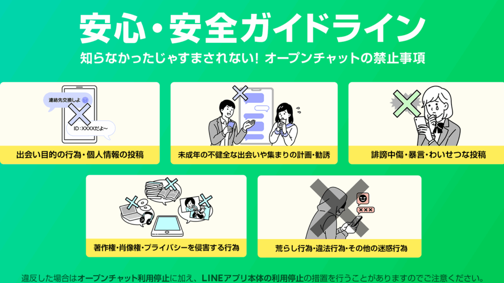 これらの行為は、オープンチャットの利用体験を著しく損なうため注意が必要です。