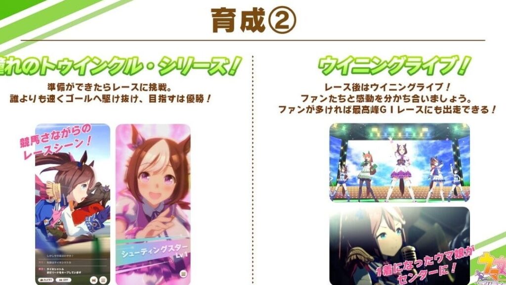 ウマ娘のゲームプレイは、プレイヤーがトレーナーとなり、個性的な美少女キャラクターを育成することに重点を置かれています。このシミュレーション要素がプレイヤーを魅了し続けています。