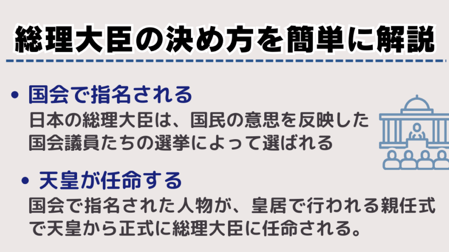 - 天皇の任命: 議会の承認を経て、天皇が正式に総理大臣を任命する。