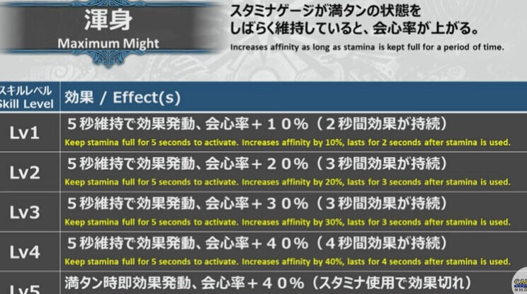 - スタミナ管理が重要です。 満タンに近いスタミナを保つことが、スキル発動の条件となります。