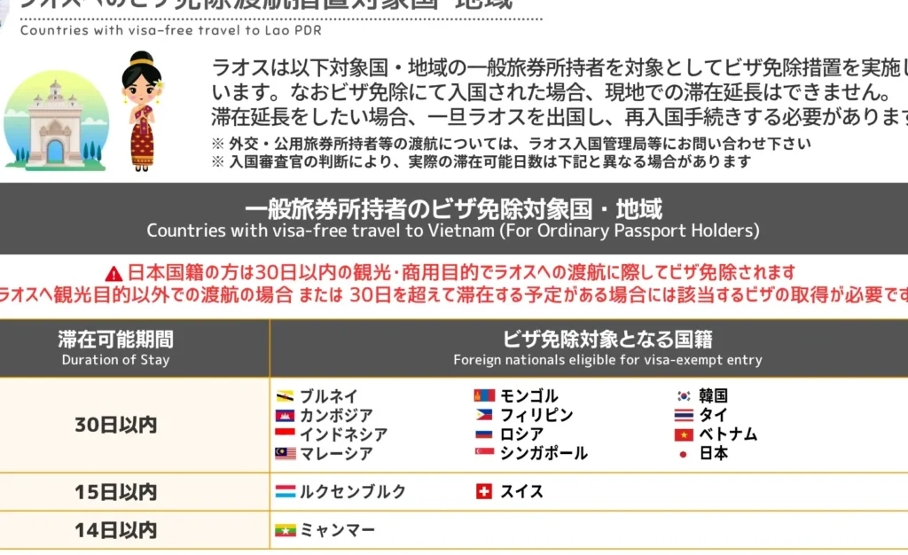 ビザの取得: ラオス入国時に観光ビザが必要な場合があります。30日間の観光ビザは空港や陸路で取得可能です。