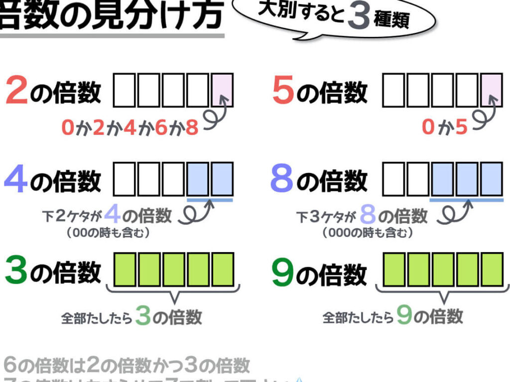 倍数の判定法はいくつかの種類があり、それぞれ特定の数字に基づいています。私たちは、これらの判定法を用いて、簡単に倍数を識別できます。以下に、主要な倍数の判定法を示します。